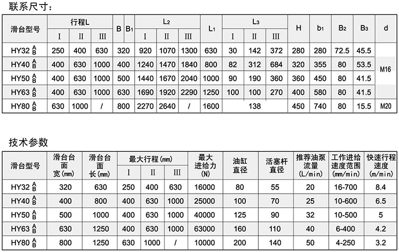 HY系列液压滑台是用以实现进给运动的动力部件,配以各种切削头及支承部件以组成不同类型的组合机床,用以完成钻、扩、铰、锪窝、刮端面、倒角、车端面、铣、攻丝等工序。HY系列液压滑台分A、B丙型。A型双矩导轨,B型一山一矩组合导轨。
